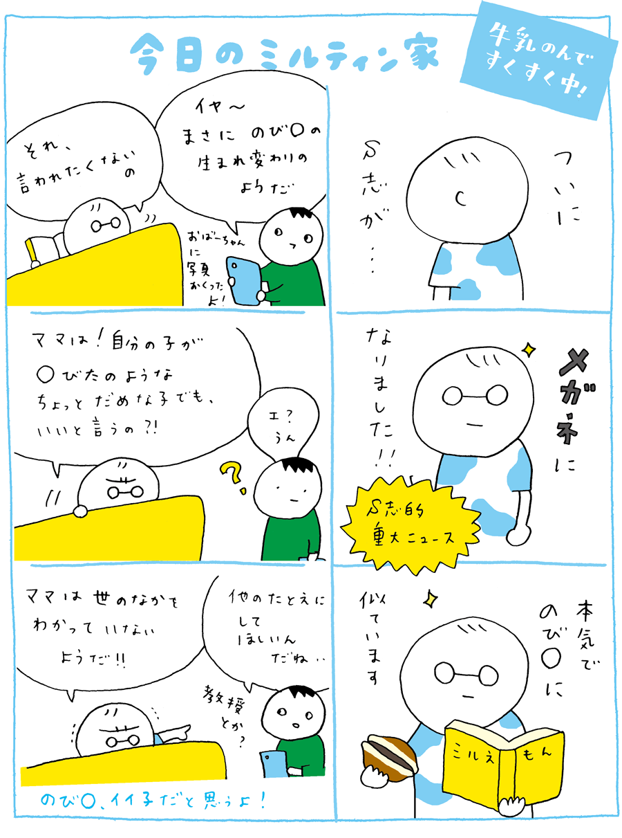 でも、ドラえ○んでいちばん好きなキャラはのび○っていうんですけども。自分が言われると、心のなかの何か揺らぐのか。プライド問題が面倒くさくなってくるお年頃です。なんにせよ、これからわが家のミルティンくんことS志はメガネキャラとなります!